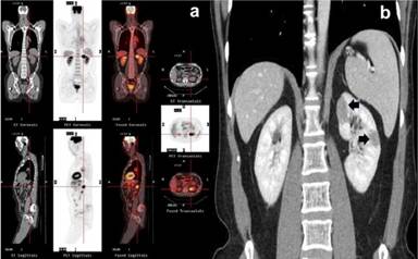 Figure 9. Composite PET/CT (a. crosshair) and coronal CT (b. arrows) show lesions of the left kidney. Case#2. |
