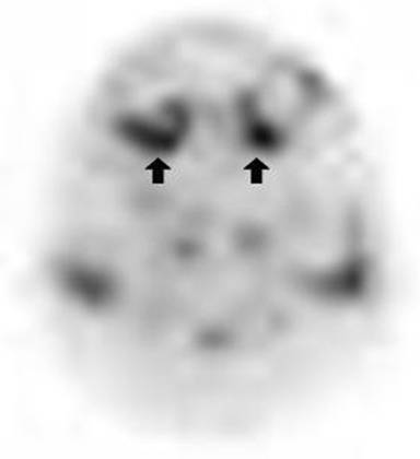 Figure 12. Axial PET image show bilateral retro-orbital hypermetabolic lesions (arrows). Case#3. |