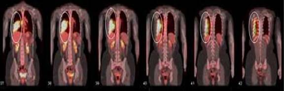 Figure 13. Coronal fused PET/CT images show extensive right lower lung and pleura hypermetabolic lesions (circle). Case#3. |