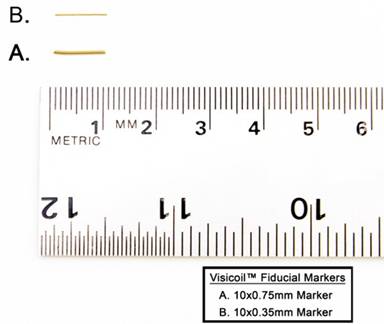 Figure 2. VisicoilTM fiducial markers of different caliber: A. 10x0.75 mm; B. 10x0.35 mm. |