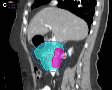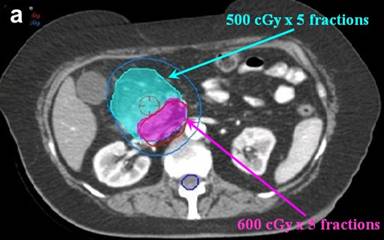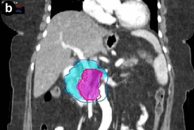 Chuong et al. have reported the initial Moffitt clinical outcomes with this technique for borderline resectable pancreatic adenocarcinomas, noting a 61% rate of conversion to R0 resection (Abstract #302; Figure 5b) [19]. For the patients with PNETs, fiducials were used for planning only since a fractionated course of radiation was delivered along with continuous infusion 5-flourouracil. Conventionally fractionated treatment was delivered with an intensity-modulated radiation therapy compensator based technique. PNETs were reimaged in 4-6 weeks with pancreas protocol CT. Radiation was well-tolerated in both patient populations. No complications were reported [19].