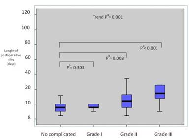 Figure 1. Box and whiskers plot showing the relationship between the length of the postoperative stay and the Clavien-Dindo classification. The boxes represent the interquartile ranges and the lines within the boxes show the median values. The whiskers represent the extreme values. The comparison between non-complicated patients and complicated patients demonstrates a significantly shorter length of hospital stay (P<0.001) in non-complicated patients (grade IV was excluded due to the small sample: No. 1). a Progressive increase: linear trend ANOVA b Comparison of each grade with non complicated patients: ANOVA with simple contrast |