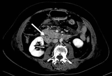 Figure 1. Abdominal CT scan: a ring of inflammatory tissue surrounding the second duodenum (arrow) leading to the diagnosis of annular pancreas and acute pancreatitis confined to the annulus and the adjoining pancreatic head. |