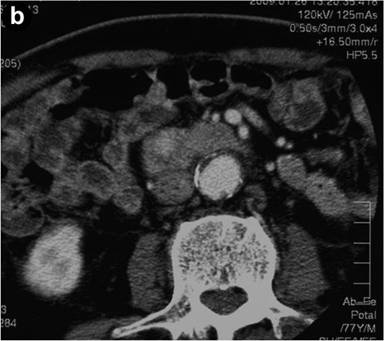 Signet-ring cell carcinoma was first described by Sekoguchi et al. in 1979 [2]. Since then there have been 23 cases previously reported [2, 3, 4, 5, 6, 7, 8, 9, 10, 11, 12, 13, 14, 15, 16, 17, 18, 19, 20]. Histologically, the origin of signet-ring cells remains unknown, but the following hypotheses have been proposed by various investigators. One is that signet-ring cell carcinoma arises from ectopic gastric mucosa found in the duodenum. Gardner et al. and Ramia et al. observed ectopic gastric mucosa peritumorally [3, 10]. Another theory is that signet-ring cell carcinoma arises from areas of gastric-type metaplastic epithelia. These metaplastic changes are considered to be a protective response to elevated acidity and have usually been seen at the duodenal bulb in peptic ulcer patients [21]. In this theory, signet-ring cell carcinoma originates from periampullary duodenal heterotopias of an ulcerative etiology and expands to the ampulla of Vater. In our case, there was no ectopic gastric mucosa found in the peritumoral mucosa, and the patient had no history of peptic ulcer disease.