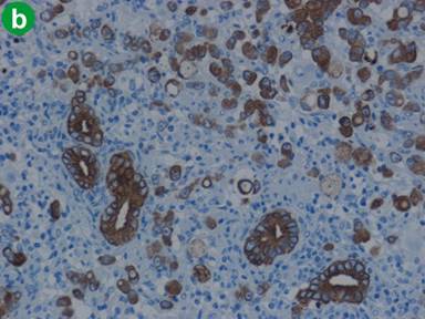 Figure 5. Both signet-ring cells and adenocarcinoma cells stained positively for CK7, but negatively for CD20 (a. H&E, x100; b. Immunohistochemical findings for CK7, x100; c. CK20, x100). |