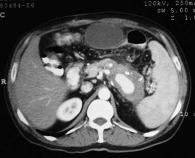 A 47-year-old male patient presented to our out-patient department with a 1-month history of non-radiating epigastric abdominal pain, moderate to severe in intensity occasionally requiring injectable analgesics. There was a history of occasional vomiting. He had been an alcoholic for the past 15 years. Diabetes had been detected 6 months previously and was controlled with an oral hypoglycemic. There was no history of hematemesis, melena, fever, jaundice, altered bowel habits, anorexia or weight loss. He had undergone an open cholecystectomy 3 years previously for symptomatic gallstones. Physical examination was non-contributory. The patient was initially evaluated elsewhere with abdominal ultrasound which revealed a multilayered lesion with a peripheral anechoic area contiguous with the splenic artery and another cystic lesion (5.5x4 cm) close to the anterior abdominal wall. The patient was admitted to our center and underwent further evaluation.