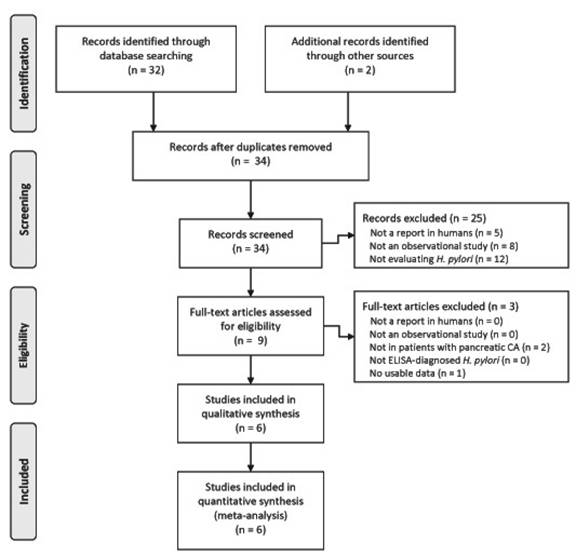 Our initial search strategy yielded 32 potential citations for inclusion. Two other additional records were identified through other sources. Of those, 25 were excluded through review of the abstracts due to either not being a report involving human subjects (n=5) or an observational study (n=8), or not evaluating the presence of H. pylori infection (n=12) leaving 9 articles for full publication review. Out of these, two studies were excluded because no patients with pancreatic neoplasms were involved and an additional study by Kosunen et al. [20], which was included in the earlier-published meta-analysis by Risch et al. [11], was excluded from our analysis due to the lack of reliable data on pancreatic cancer; therefore, a total of 6 observational studies (n=2,335 patients) met our eligibility requirements (Figure 1) [7, 8, 9, 10, 11, 12].