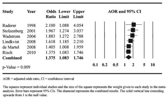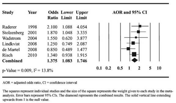 We also realize that our study has several limitations. Our primary endpoint included pooled data of adjusted OR pulled from the included studies. The variables used to adjust these values were not consistent across studies, which may limit the reliability of the data. Too few studies were identified to allow for subgroup analysis by covariates. Second, as with any meta-analysis, the potential for publication bias is a concern. As such, the results of our study must be interpreted in the context of its possibility. However, visual inspection of the funnel plots were did not identify any significant publication bias. This is further strengthened by the non-significant findings using Egger’s weighted regression statistic. Lastly, although a statistically significant association between H. pylori and pancreatic cancer was seen in our pooled analysis, the AOR is relatively modest. Some epidemiologists have suggested that an odds ratio of greater than 2 is required for clinical relevance. Since the AOR we found was 1.38, the clinical relevance of the association could be debated. This should not discount the association; rather justify the need for causative future studies.