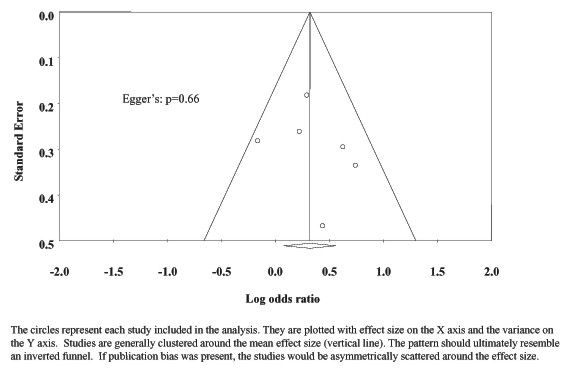 Our meta-analysis of one good-quality [9], four fair-quality [7, 8, 10, 11], and one poor quality [12] observational studies showed a significant association between H. pylori seropositivity and development of pancreatic cancer (AOR 1.38, 95% CI: 1.08-1.75; P=0.009) (Figure 2). No significant statistical heterogeneity was seen (I2=13.8%). Visual inspection of the funnel plot (Figure 3) could not rule out the possibility of publication bias, however Egger’s weighted regression analysis suggested a low likelihood (P=0.662). When the three observational studies [8, 10, 11], out of the four with fair-quality, that reported CagA positive status were pooled, no significant association was seen (AOR 1.14, 95% CI: 0.66-1.97; P=0.639).