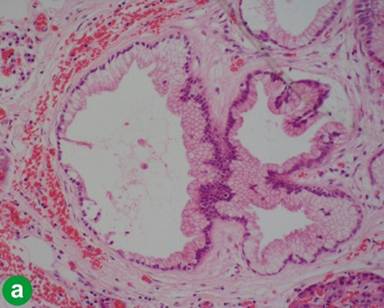 Figure 2. Pancreatic intraepithelial neoplasia observed in pancreatectomy specimens. a. A pancreatic duct in the Whipple specimen shows mucinous hyperplasia with minimal cellular atypia. b. A duct adjacent to the mass in the distal pancreatectomy specimen exhibits mucinous metaplasia, papillary folding, and nuclear atypia. All images: H&E, x400. |