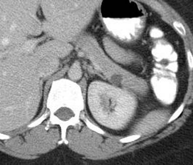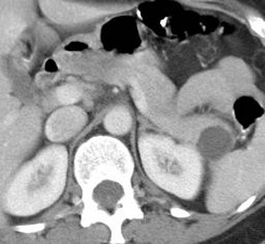 Figure 4. CT scan of a small cyst in the pancreatic tail. (Patient #2). |