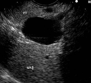 Figure 2. Initial EUS revealing a 29 mm cyst in the pancreatic tail. (Patient #1). PT: pancreatic tail; SPL: spleen |