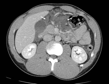 Figure 2. Large amount of high attenuation fluid in the lesser sac and around the pancreas consistent with hemorrhagic reaction (arrows). |