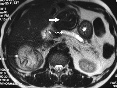 Figure 5. T-weighted magnetic resonance image in the same patient demonstrating high signal intensity due to the cystic lesion in the head of the pancreas with an obstructed biliary ductal system (Patient #6). |
