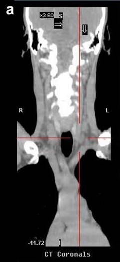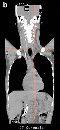 Figure 1. CT scans of Patient #1 before (a.) and after (b.) chemotherapy. CT scans do not demonstrate presence of supraclavicular metastasis in Patient #1. |
