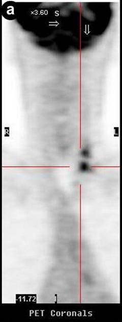 Figure 2. PET scans of Patient #1 before (a.) and after (b.) chemotherapy showing supraclavicular metastasis. |