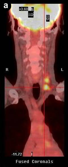 A 79-year-old Caucasian male with past history significant for follicular papillary thyroid carcinoma was treated with partial thyroidectomy. Four years after surgery, he presented with left sided supraclavicular lymphadenopathy associated with swelling of his neck. FNAC of a left supraclavicular lymph node showed an atypical population of cells characteristic of, but not specific for, papillary carcinoma. Given the patient’s history of thyroid cancer, this was felt to be the most consistent with recurrent papillary thyroid carcinoma. An ultrasound of the head and neck also demonstrated a left sided lobulated, irregular supraclavicular lymph node. The patient was recommended to undergo complete thyroidectomy with thyroid replacement and radioactive iodine treatment given the presumption that he had recurrent, metastatic papillary thyroid cancer.