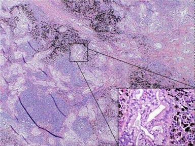 Figure 4. Microphotograph of a left supraclavicular lymph node of Patient #3. Malignant glands (magnified in inset 200x) are present in lymphoid tissue with anthracotic pigment (50x magnification; hematoxylin & eosin stain). |