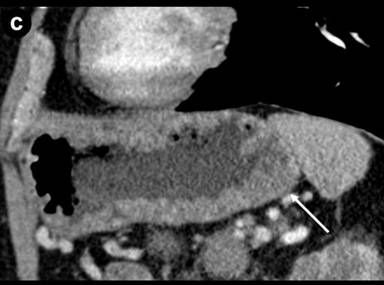 A characteristic finding in patients with autoimmune pancreatitis is the heavy predominance of IgG4-positive plasma cells. Up to 91% of patients demonstrate elevated IgG4 levels either on serology or immunohistochemistry [10, 11]. Recent research has demonstrated the extension of IgG4-associated autoimmune disease to organs other than the pancreas [10]. Though the imaging characteristics of autoimmune pancreatitis have been well established in the radiologic literature, descriptions of extrapancreatic involvement are sparse [5]. To the best of our knowledge, associated changes within the gastrointestinal tract have only been described endoscopically and histopathologically.