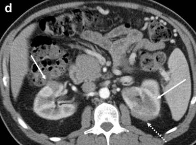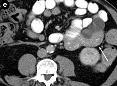 Figure 1. a. Axial MDCT image of the abdomen with intravenous and oral contrast demonstrates a thickened, “sausage-like” pancreas with a hypodense rim of tissue (arrow). b. Axial MDCT image of the abdomen with intravenous and oral contrast demonstrates a thickened and nodular appearance of the stomach wall at the level of the gastric body measuring up to 1.4 cm (arrow). c. Sagittally reformatted MDCT image of the abdomen shows the thickened and nodular gastric body wall, most pronounced posteriorly (arrow). d. Axial MDCT image demonstrates bilateral renal lesions (arrows) with a soft tissue attenuation within and immediately adjacent to the left kidney (dotted arrow). e. Axial MDCT image demonstrates focal jejunal wall thickening. |