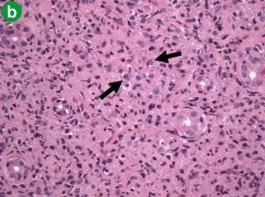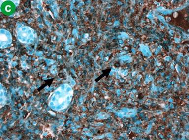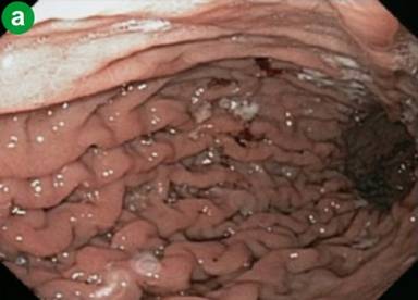 Figure 2. a. Endoscopic image demonstrates non-erosive gastric inflammation characterized by wall edema and mildly thickened folds. b. Hematoxylin-eosin stain of the gastric mucosa demonstrates a crushed infiltrate effacing the normal architecture with numerous plasma cells (arrows) (400x). c. Immunohistochemistry demonstrates IgG4 positivity (arrows) (400x). |