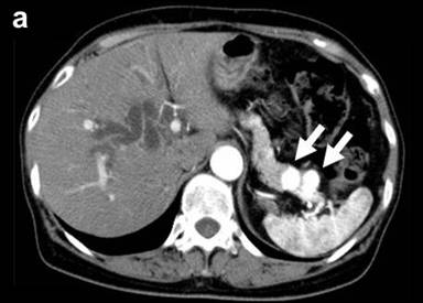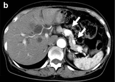 A 67-year-old female was referred to our hospital, complaining of jaundice, appetite loss and 3 kg of body weight loss over one month. She had undergone a thyroidectomy for a thyroid adenoma and a right oophorectomy for an ovarian tumor at 41 years of age and a right nephrectomy for renal cell carcinoma at 47 years of age. Laboratory data demonstrated mild liver dysfunction due to obstructive jaundice without elevation of plasma CEA and CA 19-9 levels. Computed tomography (CT) demonstrated a remarkably enhanced tumor measuring 55x40 mm in diameter in the head, two tumors measuring 2.0 and 1.8 cm in the body, and two tumors measuring 1.2 and 1.0 cm in the tail with a similar enhancing effect (Figure 1abc). CT angiography did not demonstrate any abnormalities of the arteries and the dorsal pancreatic artery branching from the origin of the splenic artery (Figure 1d). Magnetic resonance imaging demonstrated obstruction on the intrapancreatic bile duct due to a pancreatic head tumor and a slight dilatation of the main pancreatic duct in the body and tail of the pancreas. Fluorine-18 fluorodeoxyglucose positron emission tomography detected an elevated uptake in the isolated multifocal metastatic pancreatic tumors without any extrapancreatic uptake. A biliary drainage tube was inserted endoscopically. Cytology of the pancreatic juice was negative. The patient was diagnosed with isolated pancreatic metastases from renal cell carcinoma. The huge tumor located in the head was resected by a pancreaticoduodenectomy and the four tumors located in the body and in the tail of the pancreas were resected by a distal pancreatectomy, preserving the cervical portion. Intraoperative confirmation of arterial perfusion in the middle segment was necessary. In other cases, a total pancreatectomy should be done. Enucleation was not considered due to the risk of main pancreatic duct injury.
