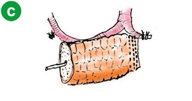 Figure 2. Schema of procedure for a middle-preserving pancreatectomy. a. Transection of the pancreas above the portal vein. b. Confirmation of arterial perfusion in the middle segment after clamping the splenic artery and the body of the pancreas. c. Preservation of the middle segment of the pancreas. d. Reconstruction following a middle-preserving pancreatectomy. |