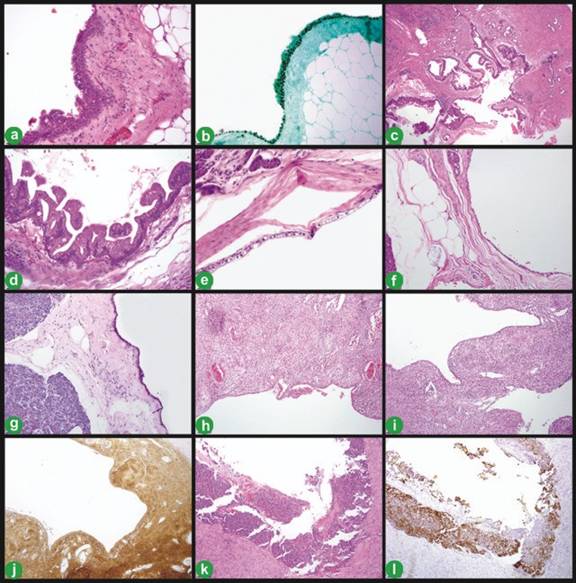 Figure 1. Squamoid cyst of pancreatic ducts (H&E 200x: a). Immunohistochemistry for p63 (200x, b.). Intraductal papillary mucinous neoplasm, benign (H&E: 100x, c.; 400x d.). Oligocystic serous cystic neoplasm (H&E: 400x, e.; 100x, f.). Periodic acid Schiff stain (100x, g.). Schwannoma with cystic degeneration (H&E 100x: h. i.). Immunohistochemistry for S100 (100x, j.). Neuroendocrine carcinoma with cystic degeneration (H&E 100x: k.). Immunohistochemistry for chromogranin (100x, l.). |