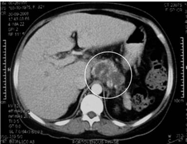Figure 1. Axial tomography image showing a large multi-loculated pancreatic abscess (circle) affecting the body of the pancreas (Case #1). |