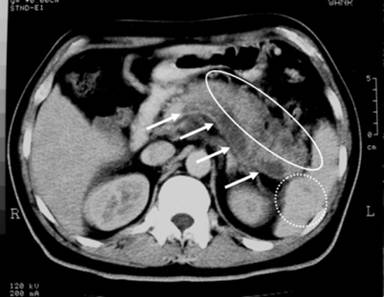 Figure 2. Axial computed tomography image showing multiple abscesses (hypoechoic lesions) in the body and tail regions of the pancreas (oval), splenic vein thrombosis (long tubular hypoechoic structure) indicated by white arrows and splenic micro-abscesses (dotted circle). Follow-up scan showed resolution of the abscesses and recanalization of the splenic vein (Case #2). |