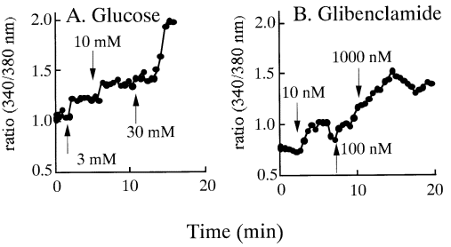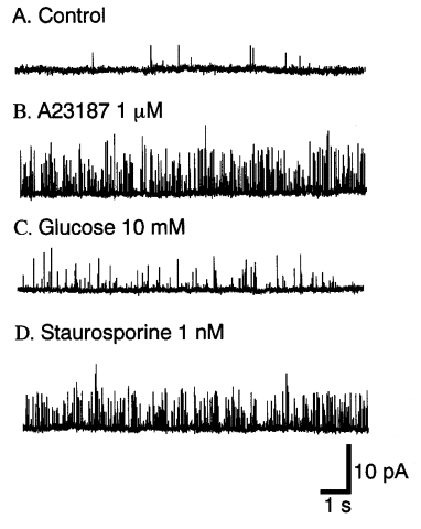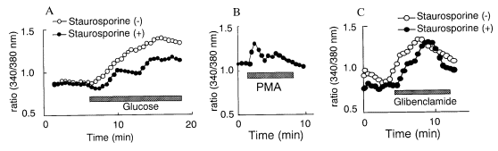 Staurosporine (1 nmol/L) also attenuated the glucose-induced elevations in [Ca2+]i.