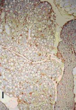Figure 3. Day 3½ post PDL pancreatic tissue. ICC stained for glucagon. x100. Bar = 100 µm.