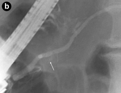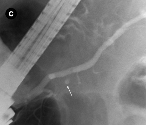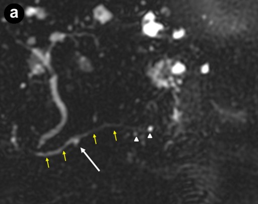 Figure 1. "Low-risk" branch duct intraductal papillary mucinous neoplasm. 3-D MRCP (a.) image shows several small cystic lesions (white arrow and arrowheads) projecting near the main pancreatic duct (yellow arrows). Subsequent sequential ERCP images (b., c.) show slow opacification of the cystic lesion in the pancreatic head (white arrows) with increasing contrast administration, corresponding to the cystic lesion identified on MRCP (a.: white arrow). Although a bridging duct or stalk was not well visualized, communication with the main pancreatic duct is inferred due to its opacification with contrast. Other cysts in the pancreatic tail are not seen possibly because of viscous mucin or papillary growth obstructing the ductal lumen. |