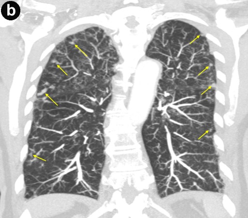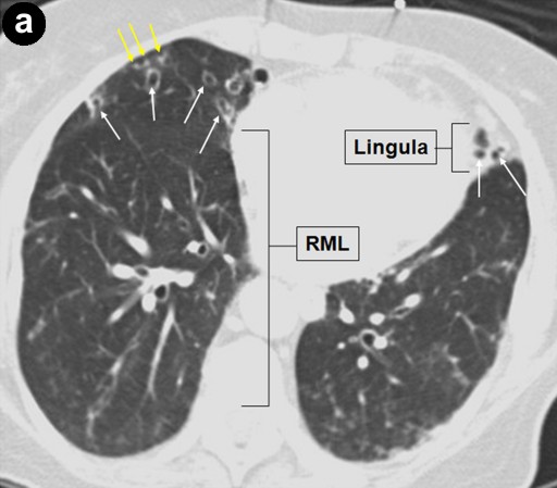 Figure 2. Lady Windermere syndrome. Axial CT image (a.) shows bronchiectasis (white arrows) in the right middle lobe (RML) and lingula with clustered small nodules (yellow arrows) representing bronchioles filled with mucus, fluid, or pus ("tree-in-bud" appearance). In addition, coronal CT image (b.) shows "tree-in-bud" appearance involving both upper lobes as well as the lower lungs (yellow arrows); this is consistent with Mycobacterium avium-intracellulare complex infection. |