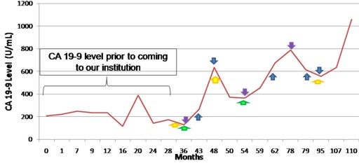 Figure 3. CA 19-9 level and different imaging modalities during follow-up of "low-risk" branch-duct IPMN. Lady Windermere syndrome and "low-risk" branch-duct IPMN are both associated with raised CA 19-9. We suspected elevated CA 19-9 level was secondary to both disease processes. Arrow legend: yellow: EUS (n=3); green: ERCP (n=2); purple: pancreatic CT protocol (n=3); blue: MRCP (n=5). |