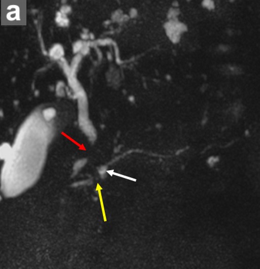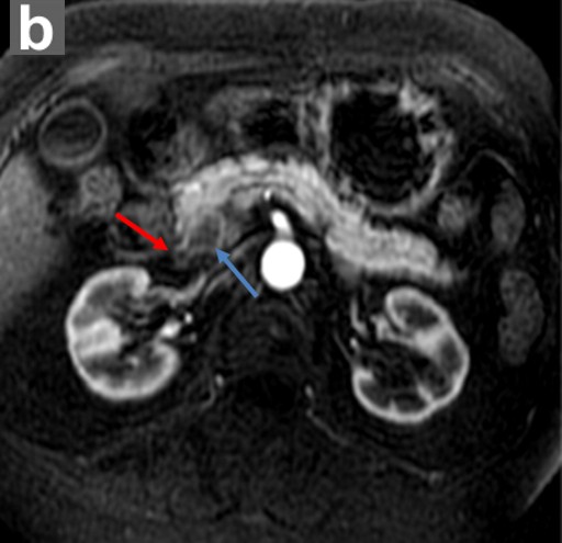 Figure 4. Pancreatic ductal adenocarcinoma. An annual follow-up 3-D MRCP (a.) image shows loss of continuity of the distal common bile duct (red arrow) and pancreatic duct (yellow arrow) due to an obstructing mass. Note that this finding is adjacent to the subcentimeter cyst identified on the prior MRCP and ERCP (white arrow). Axial, enhanced MR image (b.) in the same patient on the same date shows that the mass (blue arrow) is hypovascular relative to normal enhancing pancreatic parenchyma. This is the typical enhancement pattern of a ductal adenocarcinoma. Red arrow identifies the close proximity of the common bile duct with the pancreatic mass. |