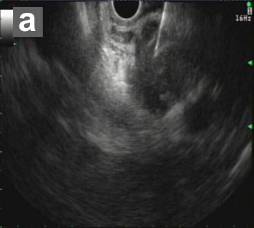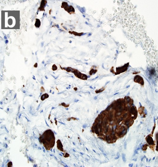 Figure 5. EUS-FNA (a.) of pancreatic ductal adenocarcinoma. Immunohistochemical staining of the FNA specimen (b.) for cytokeratins, AE1:AE3 (Ventana, Tucson, AZ, USA; predilute), and CAM5.2 (Becton Dickinson, San Jose, CA, USA; diluted 1:1) shows strong reactivity of the malignant epithelial cells infiltrating a desmoplastic stroma. Both stains are performed on BenchmarkXT® (Ventana, Tucson, AZ, USA) stainer with ultraView® (Ventana, Tucson, AZ, USA) multimer detection system. |