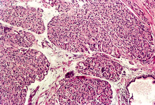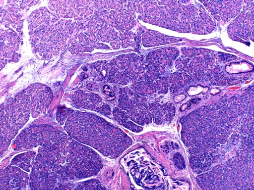 Figure 3. Pancreatic acini and ducts with a few interspersed smooth muscle fibers (H&E, x50). |