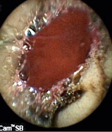 Figure 1. Capsule endoscopy: a pool of fresh blood in the proximal jejunum with no underlying ulcer. |