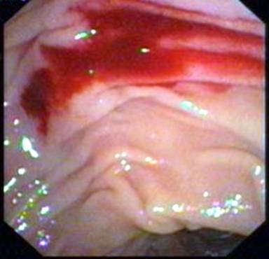Figure 2. Side view endoscope: fresh blood near the papilla. |
