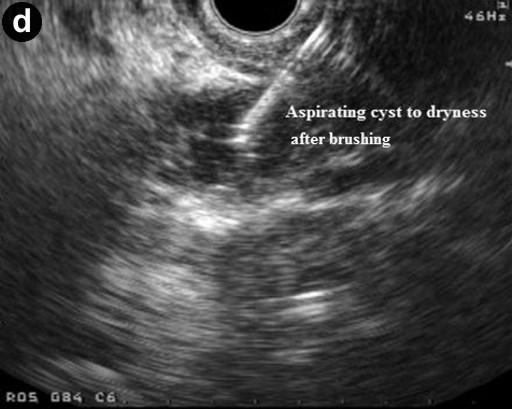 Figure 1. Linear endoscopic ultrasound showing EUS-guided brushing of a cystic pancreatic lesion. a. EUS-FNA 19 G needle entering a cystic lesion in the head of the pancreas. b. The cyst being aspirated. c. The cyst wall being brushed by echobrush introduced through the needle. d. The cyst aspirated to dryness after cyst wall brushing. |