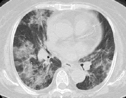 Figure 1. Chest CT on admission showing bilateral diffuse ground-glass opacities in both lungs. |