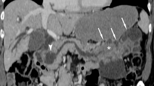 Figure 1. Curved coronal CT image of the pancreas in the portal venous phase of contrast enhancement. Communication of the mainly cystic intraductal oncocytic papillary neoplasm to the main pancreatic duct in the pancreatic head (arrowhead) and tail is clearly depicted (arrows). Please note the considerable size of the solid tumor part in the tail of the pancreas (asterisk). |
