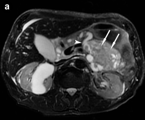 All cystic tumor parts as well as the coexisting right-sided kidney cysts showed higher intensity on diffusion-weighted imaging (b=150 s/mm2) as compared to the solid tumor nodules, with slightly less intensity on b=500 s/mm2, indicating a strong T2 shine-through effect. Apparent diffusion coefficient maps confirmed the T2 shine-through effect by showing high values for all cystic parts and low values for the solid tumor part [26]. In a recent study, significant differences between the signal intensity ratios of pancreatic cystic lesions were found on images at a b factor of 1,000 s/mm2, making the differentiation of pancreatic cysts possible [27]. However, with a higher b factor (b =1,000 s/mm2), we obtained a very low signal-to-noise ratio causing anatomic distortion due to susceptibility effects which did not allow diagnostic image interpretation. This is a well-known problem for echo-planar sequences with higher b-values resulting in greater image distortion [28].