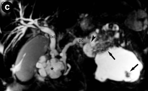 Figure 2. a. Axial T2-weighted image at the level of the pancreas shows the manifestation of the intraductal oncocytic papillary neoplasm in the pancreatic tail. Communication to the pancreatic duct can be identified (arrowhead) as well as the hypointense solid tumor parts (arrows). b. Axial T1-weighted image after contrast enhancement with gadolinium at the same level also shows communication to the pancreatic duct and strong enhancement of the solid tumor parts (arrows). c. MRCP clearly depicts communication of the dilated pancreatic duct (pd) with the intraductal oncocytic papillary neoplasm in the pancreatic head (asterisk) and tail (arrowhead); the solid tumor components are observable. (bd: dilated common bile duct). |