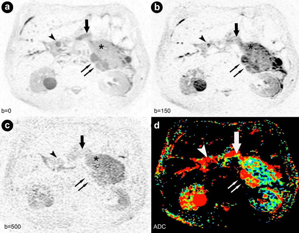 Figure 3. Diffusion weighted images at b=0, 150 and 500 s/mm2 and apparent diffusion coefficient-mapping generated from b-values at b=150 s/mm2. a. b. c. Axial diffusion-weighted images displayed with an inverted grey-scale at the level of the pancreatic tail acquired at b=0, 150 and 500 s/mm2. The diffusion-weighted imaging sequences allowed the visualization of the solid tumor parts (asterisk), the pancreatic duct (arrow), the distal common bile duct (arrowhead) as well as the cystic parts in the pancreatic tail (double arrow) with different intensity. Signal intensities of all the cystic tumor parts were highest on diffusion-weighted imaging with b-values at 0 and 150 s/mm2; with a higher b-value of 500 s/mm2, signal intensities of the cysts decreased significantly indicating a T2 shine through effect. d. Apparent diffusion coefficient-maps confirmed the T2 shine-through effect for all cystic lesions (colored red; double arrow) but not for the solid tumor parts within the cystic components and the pancreatic duct (colored blue; asterisk and arrow). Intraductal oncocytic papillary neoplasm in the common bile duct, confirmed pathologically, was not identifiable on apparent diffusion coefficient-mapping (arrowhead). |