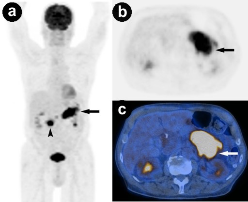 Figure 4 a. Original attenuation-corrected coronal PET image demonstrates high uptake in the pancreatic head (arrowhead) and tail (arrow). b. c. Original attenuation-corrected axial PET image at the level of the pancreas shows high uptake in the pancreatic tail (arrow). Corresponding fused FDG-PET/CT at the same level. |