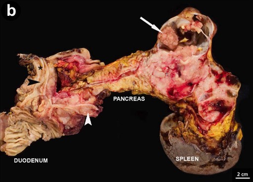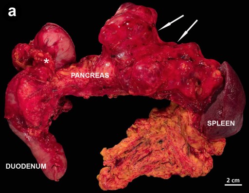 Figure 5. a. Surgical specimen composed of partial gastrectomy, duodenum, pancreas, spleen, and partial omentum. The pancreas is enlarged and shows nodular formations, mainly located in the tail (arrows). (asterisk: ductus choledochus). b. Cut surface of the pancreas, revealing a solid area in the head of the pancreas and a multilocular lesion in the tail of the pancreas with solid and cystic parts which contain slightly thick mucin and soft grey-brown luminal papillary masses (arrow). One of these papillary masses is also present in the ductus choledochus (arrowhead), close to the surgical resection margin (asterisk). Ductus choledochus and main pancreatic duct appear dilated. |