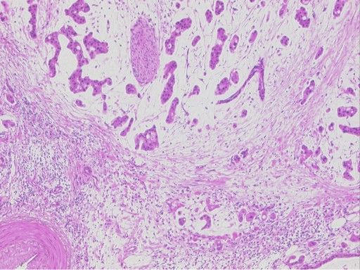 Figure 6. Microscopic features of the pancreatic tumor showing a particularly complex architecture with arborizing papillae as well as invasive areas characterized by small nests of cells with extracellular mucin accumulation. Invasion front composed of tumor cells with abundant eosinophilic cytoplasm surrounded by abundant mucin. A perineural invasion in the tumor area can also be observed as can a peritumoral desmoplastic stromal reaction. |