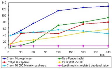 Supplying enough lipase into the duodenum to achieve more than 5-10% of normal enzyme concentrations is associated with abolition of steatorrhea in most cases [41]. However, recovery experiments in patients who ingested different preparations have demonstrated uneven lipase and somewhat more trypsin and amylase activities in the duodenum [42, 43]. There are two factors involved in the rapid disappearance of enzyme activities during their passage of intestinal tract: gastric acid secretion and proteolytic inactivation.